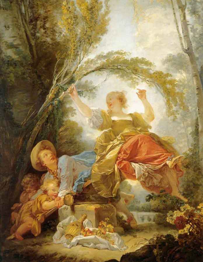 Fragonard’ın en meşhur tablosu, Salıncağın Tatlı Kazaları olarak da bilinen, Salıncak’tır. Rokoko döneminin başyapıtlarından bir olarak kabul edilir. Resim, arkada sanki o ilişkiden bihabermiş gibi gölgede kalmış adam tarafından itilen salıncaktaki bir hanımı gözlemleyen çalılıkların içinde gizlenmiş genç bir beyefendiyi tasvir ediyor. Kadın öne doğru sallandıkça, genç adam, elbisesinin altından bakıyor. Genç bey, metresinin salıncakta oturarak resmedilmesini istemiş.